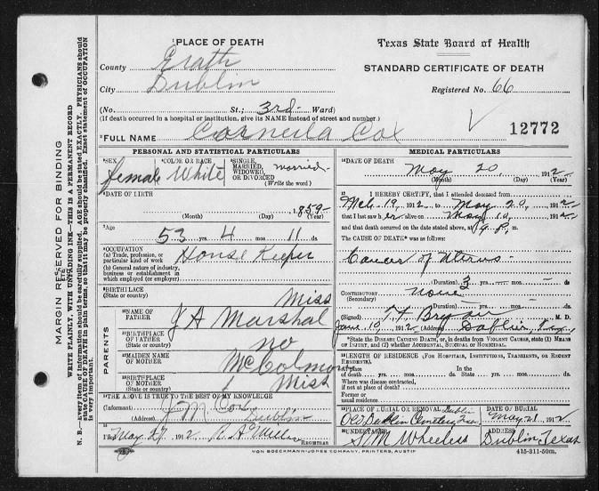 Died: 3/20/1941 (Cookville, Texas), buried at Liberty Hill (death cert. in
